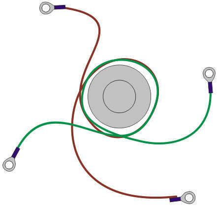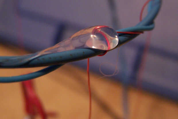 En cuatro puntos espaciados igualmente en su suspensión, por encima de los terminales de anillo en el paso 5, haga un corte a través del aislante del cable delgado y exponer algunos cobre.