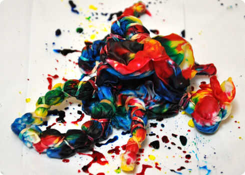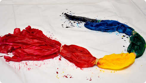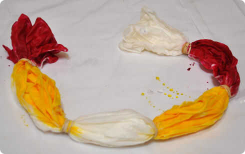 Aplicar el tinte con botellas exprimibles, pinceles, esponjas, etc., tantos colores como quieras. Comenzamos con amarillo, luego azul y rojo.