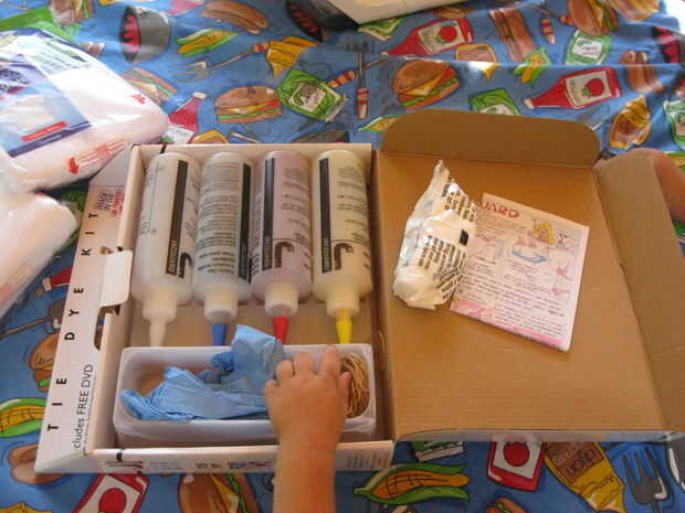 Nuestro kit de vino con un DVD sobre cómo Tie-Dye. Me puse esto para los niños mientras que se reunieron los suministros. Tenían diversión viendo el dvd para obtener ideas.