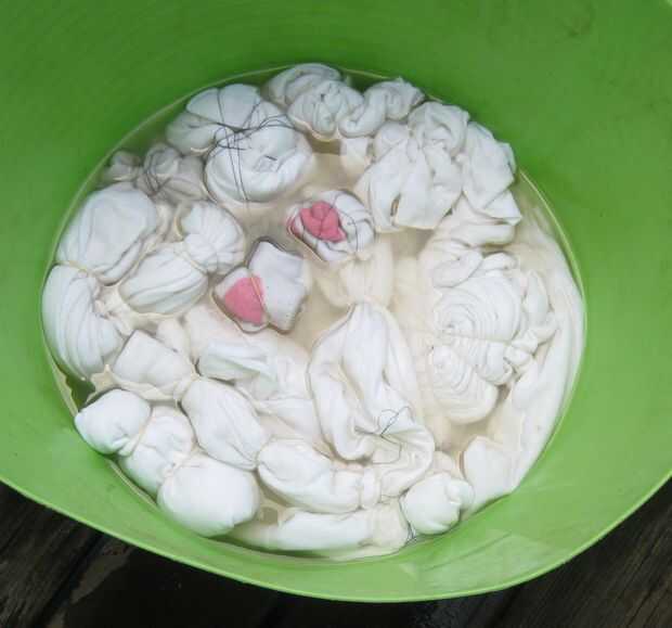Había vertido hacia fuera el cubo y rellenar con la mezcla de ceniza de soda. Poner todas las prendas de sus atadas en y dejar reposar durante 20 minutos.