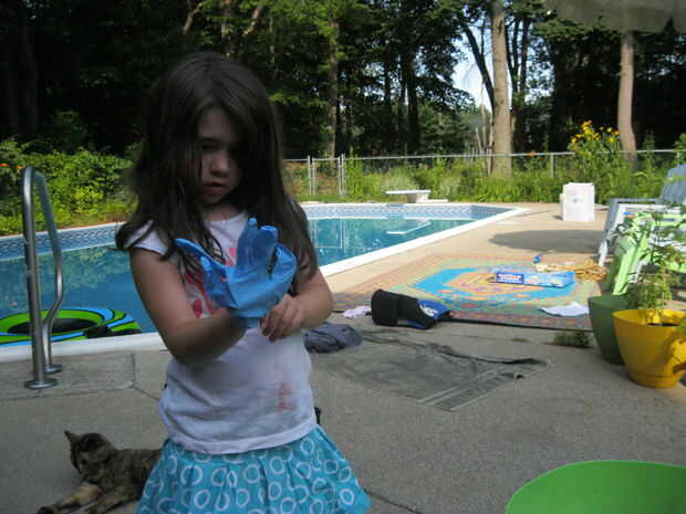 Ahora nuestro kit solo venia con 2 guantes, y tuve un tercero dando vueltas. cada uno de nosotros tiene uno, y cada uno de nosotros terminó con una mano limpia y una mano muy desordenada. no pánico, era prácticamente todo lavado apagado después de 2 días.