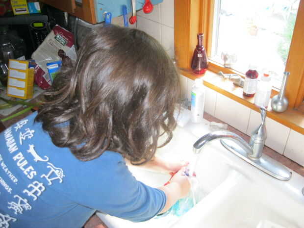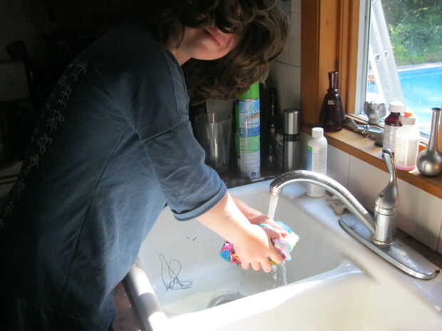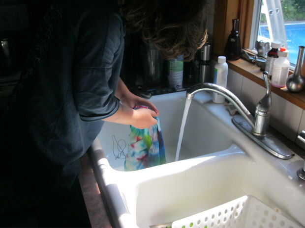 Enjuagar con agua tibia hasta que salgan limpios. Realmente no necesita guantes para este paso.