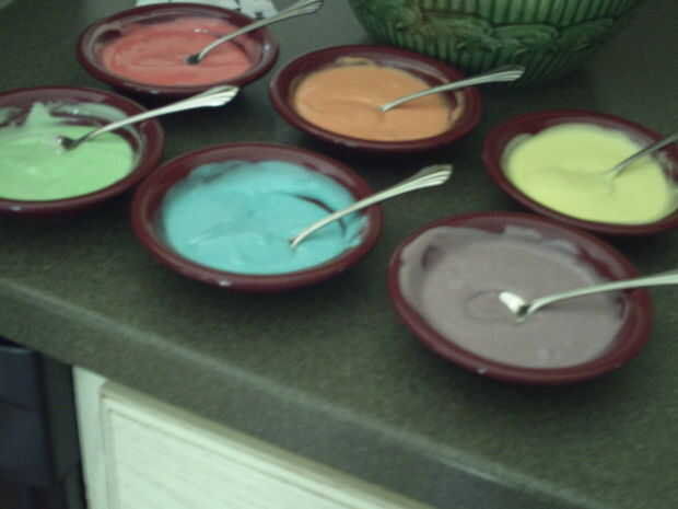 Paso uno; Realizar cualquier tipo de vainilla o pastel blancoPaso dos; Dividir la masa en tres tazones de fuentePaso tres; Hacer leer un tazón y una licencia azul la tercera VirgenPaso cuatro; Vierta la mezcla azul en la parte inferior de la bandeja