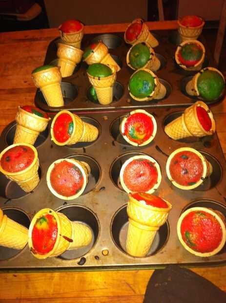 Hacer el blanco de la torta y separados en diferentes recipientes para agregar colores. Llene conos rellenar 2/3 uso 2-3 cucharadas cada uno un color diferente.