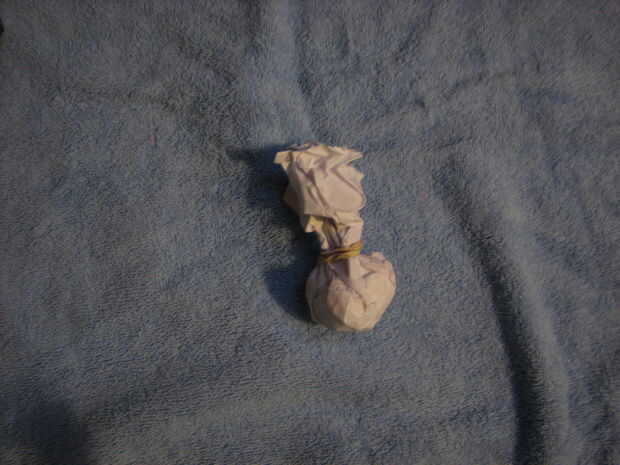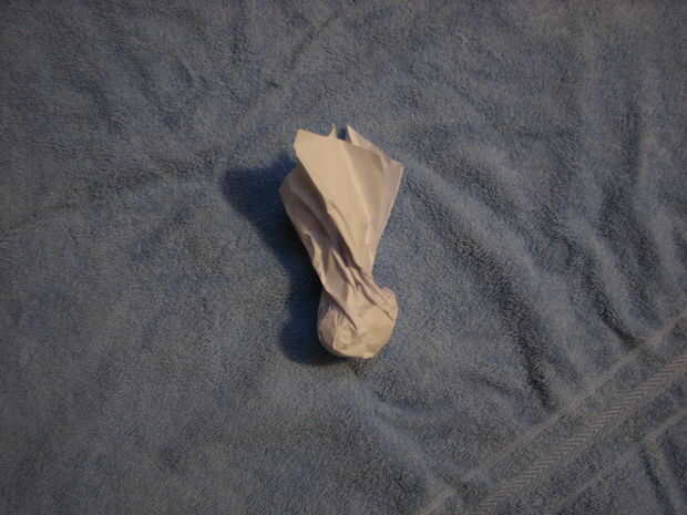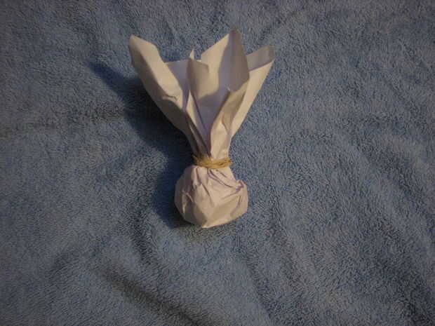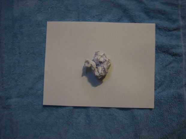 Tomar la bola de papel apenas hecho y rodeado de la otra hoja de papel, crujir la sábana encima y sobre la bola, como si fueron envolviéndolo como un regalo.