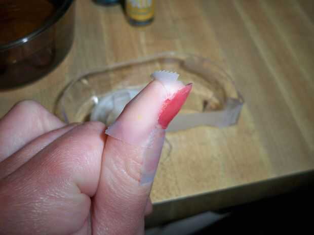 Use la cinta scotch para recluir de la uña. Pongo en la piel alrededor de la uña - esto es así cuando ponemos el diseño en la uña, la pintura no sale todo el resto del dedo.