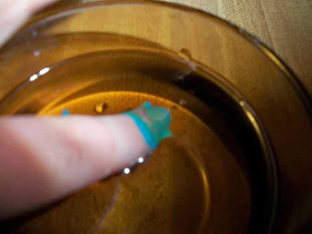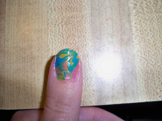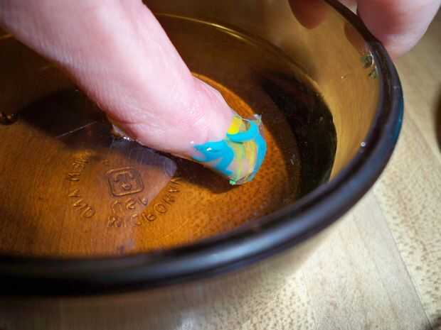Elegir su lugar favorito en el diseño y suavemente sumergir su dedo con cinta en el agua. Usted puede sumergir completamente el dedo y el esmalte se adhiere a la uña.