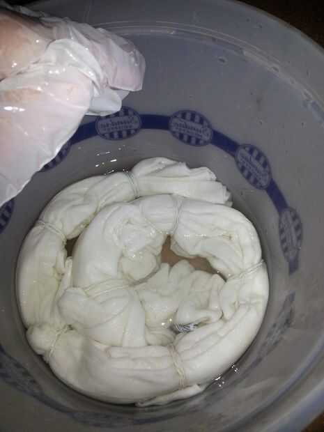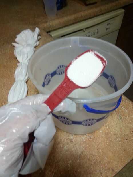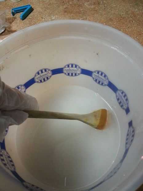 Poner dos tazas de agua caliente en el cubo y luego volcar en las cucharas de 2 mesa de ceniza de soda. Remover para disolver.