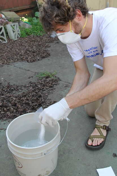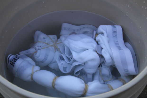 Después has torcido, atado y bandas, usted necesitará tomar los elementos en una solución de ceniza de soda antes de teñir. Esto ayudará el vínculo de los tintes a la tela y mantener tu ropa interior luminosa y brillante por más tiempo. Usar los guantes y máscara contra el polvo, disolver 8 onzas de ceniza de Soda en un galón de agua tibia. Remoje la ropa interior durante 10-15 minutos y escurrir la solución extra antes de teñir.