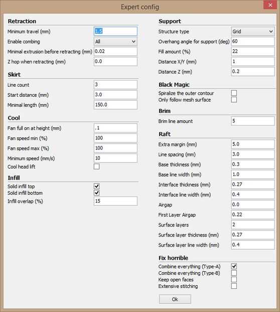 Ajustes de experto: Ángulo establecido en 60% de la proyección, llenar cantidad 22% y la distancia de 1 mm para X / Y, 0.2 para distancia Z.
