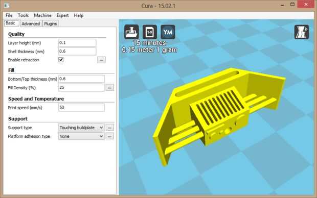 Configuración básica: Altura de la capa se establece en 0,1 mm y 0,6 mm de espesor de cáscara (que genera 2 conchas que se describe en la siguiente imagen). Para densidad de relleno usé 25%. Tipo de soporte depende de la parte impresa. Para el "panel_x1.stl" tipo de apoyo se establece en "toque buildplate".