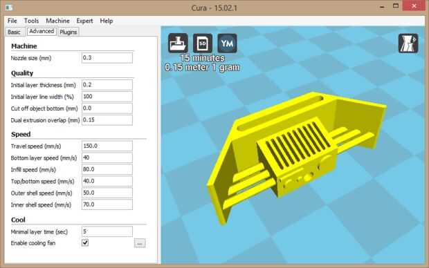 Ajustes avanzados: Ultimaker² está equipado con una boquilla de 0,4 mm, pero el valor configurado usado en CURA es 0,3 mm. Por esta razón ajuste de espesor de cáscara anterior genera 2 cáscaras externas. Esta configuración trabaja también muy bien para un colega que tiene un nuevo Extended+ de Ultimaker² con boquilla de 0,4 mm por defecto instalada.