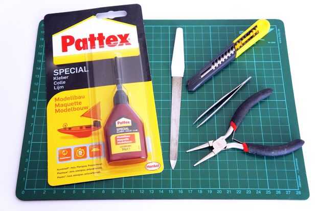 No use pegamento Cyanacrylat basado. En cambio un plástico que suaviza el plástico y pegamento se endurece en unos minutos. El pegamento debe ser en ambos lados de las piezas que se pegan. Después de poner el pegamento en las piezas tienes que esperar 1-2 minutos por lo que puede hacer su trabajo y luego presionan juntos. Generalmente después de 20 minutos tiene un buen agarre pero 24 horas para llegar a la resistencia final. Las otras herramientas son quitar el material de apoyo y limpieza del modelo.
