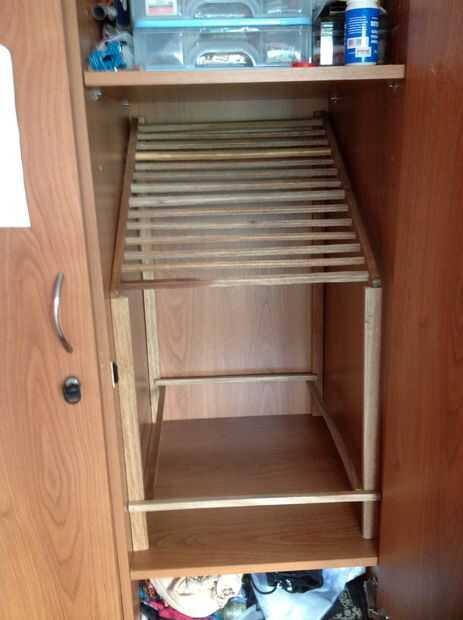 En este punto sí mismo rack (mejor una versión más pequeña de él) sirve por la caída/del clavo lo dentro de un armario, pared o detrás de las puertas! Pero hemos tenido cuestiones tales como la cantidad de lazos, queriendo no clave ni taladre la pared de armarios y la exposición al polvo!! Así que decidí dar las piernas y mantener en un estante en el armario... La parrilla debe estar en una posición inclinada todos los lazos pueden verse a simple vista y serán convenientes tomar y mantenerlos detrás. Así que tenía las piernas en dos tamaños!