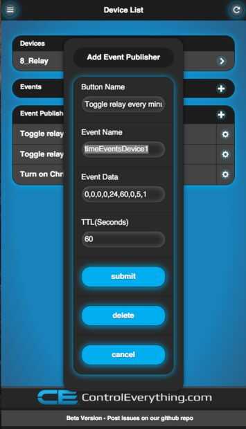 Por último, haga clic en enviar y un botón se añadirán a la lista de editor de eventos. Ahora, haga clic en el botón para publicar el evento en la nube de partículas y el regulador ver y empezar a ejecutar el programa establece. Ver como se desarrolla la magia.