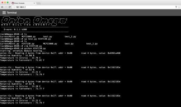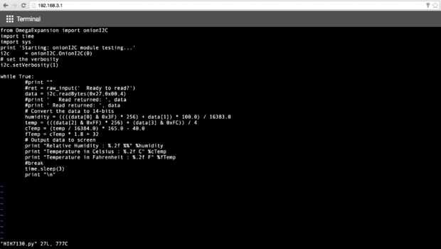 #https://www.controleverything.com/content/Humidityfrom OmegaExpansion import onionI2Cimport timeimport sysprint 'Starting: onionI2C module testing...'i2c = onionI2C.OnionI2C(0)# set the verbosityi2c.setVerbosity(1)# HIH7130 address, 0x27(39)# Read data back from 0x00(00), 4 bytes# humidity MSB, humidity LSB, temp MSB, temp LSBdata = i2c.readBytes(0x27, 0x00, 4) # Convert the data to 14-bitshumidity = ((((data[0] & 0x3F) * 256) + data[1]) * 100.0) / 16383.0temp = (((data[2] & 0xFF) * 256) + (data[3] & 0xFC)) / 4cTemp = (temp / 16384.0) * 165.0 - 40.0fTemp = cTemp * 1.8 + 32 # Output data to screenprint "Relative Humidity : %.2f %%" %humidityprint "Temperature in Celsius : %.2f C" %cTempprint "Temperature in Fahrenheit : %.2f F" %fTemp