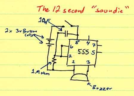 todas las piezas son soldadas o pegadas directamente sobre el 555 o el zumbador piezo. los cables soldados en el circuito va a las baterías solo son pegados a la parte superior e inferior de una pila de dos baterías de celda de botón. como un sandwich del soundie, una batería es añadida y pegada a la parte inferior. (esto es opcional, en caso su sólo se utiliza como una Granada de sonido para molestar a las personas o para el uso en un lienzo de airsoft o paintball)