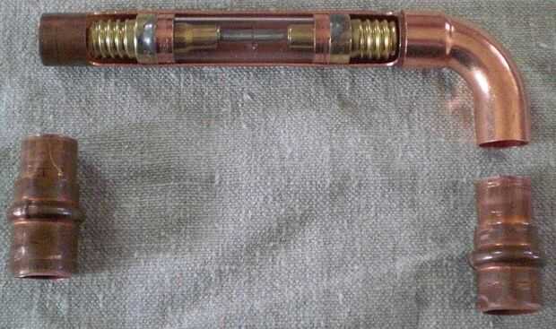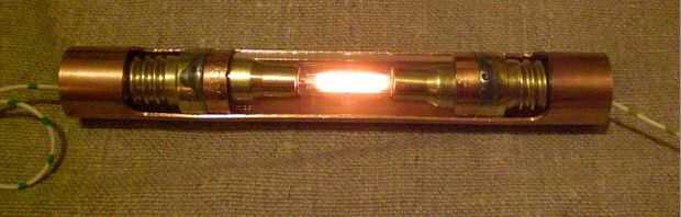 Este tubo de luz de steampunk se coloca en un separado tubo de cobre de 18mm de diámetro. El IN-24 neontube Sitges es presionado por dos partes delanteras de una caja de cartuchos; Ver también las fotos detailesd.