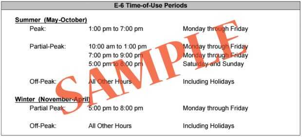 En mi caso Lea esta información y encuentra la PG & E "E-6" estaba a mi disposición y cabe dentro de lo que estuve probando hoy. Tiene diferentes horarios para el verano vs invierno, entre semana vs fin de semana y festivos y tres tipos diferentes: de pico, pico de parcial y pico completo.