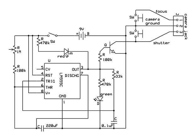 Aquí es lo que hará este circuito. Cuando se enciende, la cámara recibe una señal falsa y tomar una foto. Entonces el condensador grande se llenará lentamente de carga mientras que el verde que LED está encendido. Cómo lentamente es elegido por la resistencia variable. Cuando el tapón de descarga, el 555 salidas una señal para el transistor que conecta el control del obturador a la tierra. El rojo se ilumina el LED y la cámara toma una foto