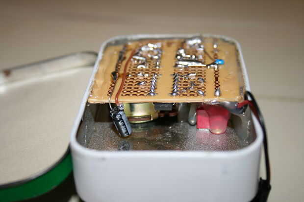 Para mí, una lata Altoids (menta verde) apenas cabe todas las tripas del circuito con espacio para una batería de 9v. Su kilometraje puede variar.