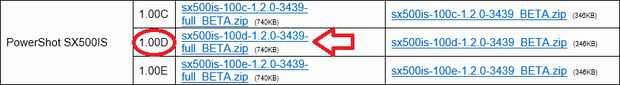 FYI: Mi cámara tiene versión la versión del firmware D 1,00 el firmware necesitaba entonces era el uno identificado por la flecha en la imagen de arriba. Si tienes firmware versión 1,00 C o 1.00E Asegúrese de seleccionar la versión correcta para tu cámara.