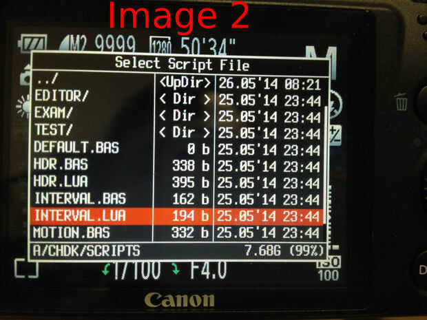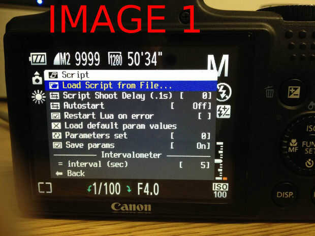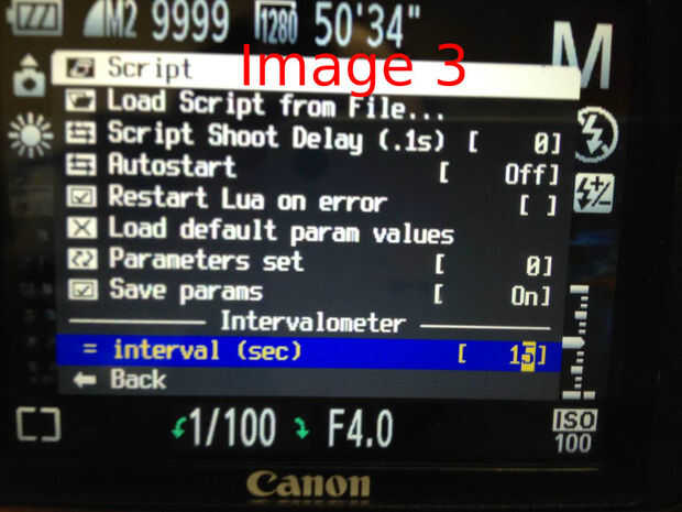 FYI: El mejor tiempo entre los marcos es poco menos de 4 segundos por marco usando un intervalómetro de software. Hay otros scripts para velocidades de fotogramas más rápidas pero la velocidad de fotogramas salta de 15 fotogramas por minuto a 43 fotogramas por minuto y no regulable ya que utiliza el modo de disparo continuo de la cámara. Esto es el equivalente de 96 x velocidad hasta 34 x velocidad de salto. CHDK es muy configurable y programable. Más scripts personalizados se pueden encontrar en la página de inicio de CHDK.