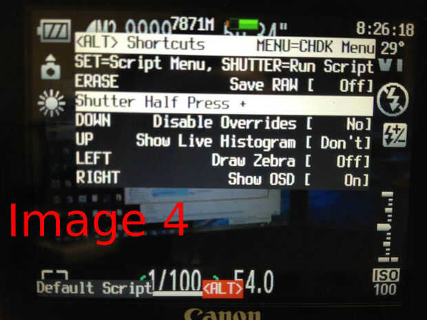 1. Prensa «Func. / Set"para abrir el menú de scripts de CHDK.