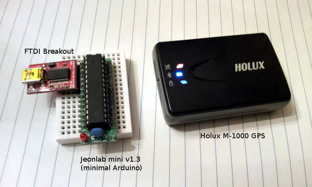 Para leer los datos en serie del GPS, usé Jeonlab mini (mínimo Arduino que hice), pero cualquier Arduino compatible board funcionará. El GPS (Holux M-1000) y el Jeonlab mini v1.3 con un tablero de arranque FTDI se muestran en el cuadro. Tengo USB al cable mini-B pero no quería cortar el cable, así que usé un conector USB-A hembra como se muestra en otro cuadro. Tenga en cuenta que sólo 3 pines (V +, GND y TX de GPS) se utilizan puesto que sólo necesito leer datos serie del GPS, no enviar cualquier comando o dato que. Para esta prueba, había conectado el pin TX del GPS a uno de los pines digitales en JeonLab mini, 10 y configurar este pin como software de puerto serie. Puesto que aún no tiene una pantalla LCD, que necesitaba salvar el hardware del puerto serie para la Junta de arranque FTDI comunicar con PC. Por eso es configurar el puerto serial de software para el GPS. Para más detalles, ver adjunto Arduino sketch.