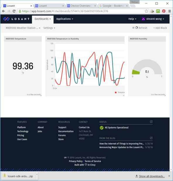 Este proyecto muestra cómo hacer uso de la plataforma MKR1000 y Losant para construir un tablero de tiempo simple monitoreo temperatura y humedad. Con sensores adicionales, otras métricas de tiempo pueden ser recogidos y analizados para que eso tablero de instrumentos más complejo puede ser construido.
