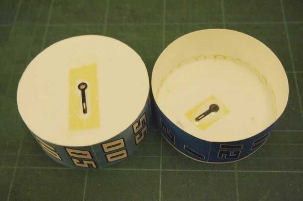 Pegar las manos en los discos. Otra vez, no mezclarlas! Mano corta durante horas (usted debe saberlo!) dentro del cilindro mientras que la larga mano fuera el cilindro minuto. El centro de los taladros de mano debe estar alineado con los signos de X en los discos respectivamente. Cuando las manos están fijas, suavemente haga un orificio en el signo de X.