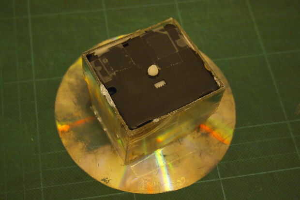 Compartimiento de la construcción para el movimiento del reloj con cartulina. Fije en el disco base. Asegúrese de que está en el centro del CD. Y también comprobar la superficie del mecanismo del reloj 45mm sobre el disco base.