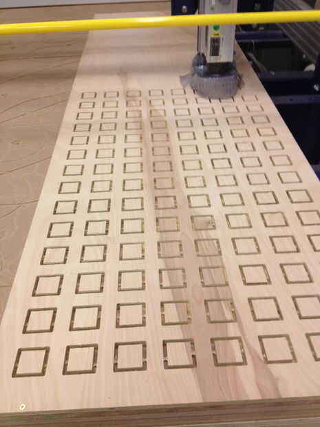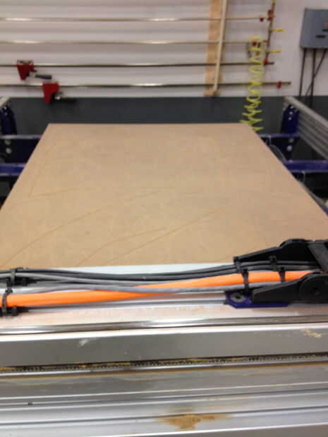Después de que tuviera el programa para el corte de cabecera, aseguró una 84" 26" pedazo de madera contrachapada de 1/2" hasta un sacrificio board (una tabla por debajo de la pieza real a cortar para que no mar la cama ShopBot) y luego utiliza el vacío ShopBot para sostenerla en lugar.  Scott en TechShop me ayudó a pasar por el programa y configurar el shopbot.