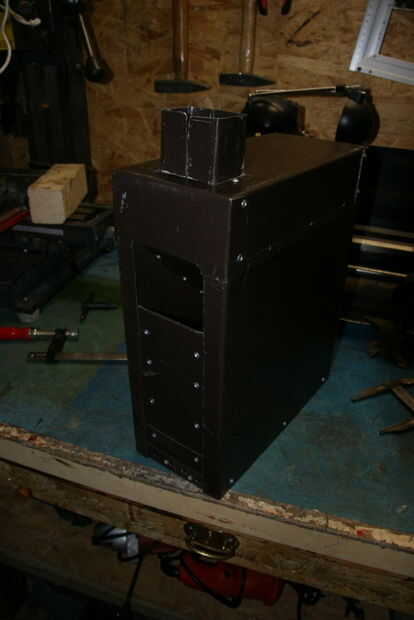 esto es una pequeña estufa de leña que construí. Se hace de una sola longitud de tubería de estufa exterior, tiene un tubo de estufa plegable (a base de conductos rodado), que afloje las piernas, un bafle, un robusto cerrojo en la puerta con un resor