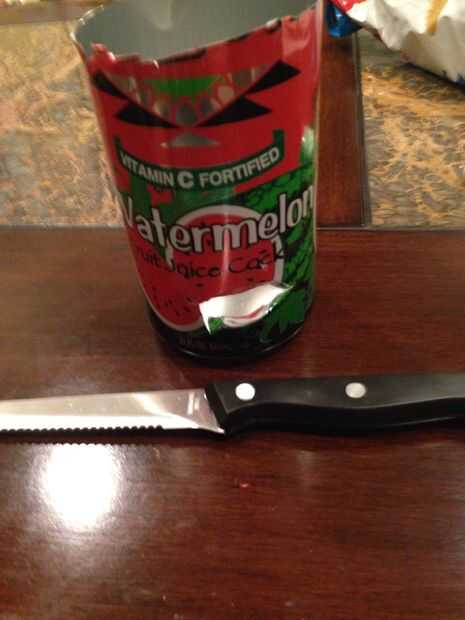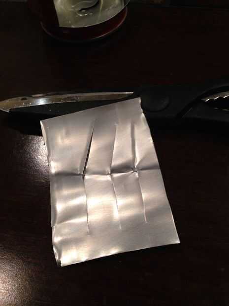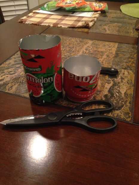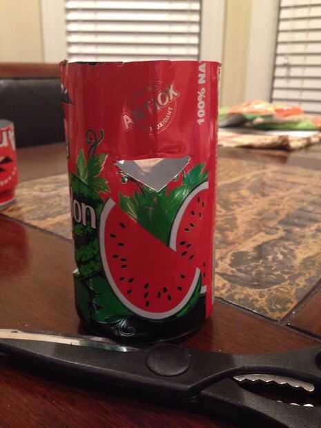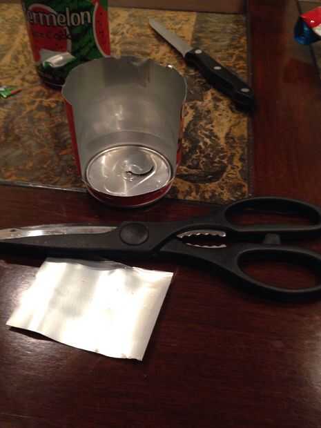 Primero usar el cuchillo y hacer un corte pequeño cerca de 3 pulgadas por debajo de la parte superior de la lata. Luego usar el cortar la lata por la mitad. Luego haga un corte aproximadamente 1 pulgada de ancho y 1/2 pulgadas 2 pulgadas desde la parte inferior. Corte 1 triángulo en forma de agujero en cada lado con unas tijeras para flujo de aire. Entonces con la parte superior la mitad de la puede cortar una pieza que es alrededor de 3 pulgadas de alto y 3-4 pulgadas de largo, esta es la rejilla de la parrilla. A continuación doblar la pieza a cortar en la mitad y líneas de corte con tijeras a utilizar como las aberturas de la rejilla.