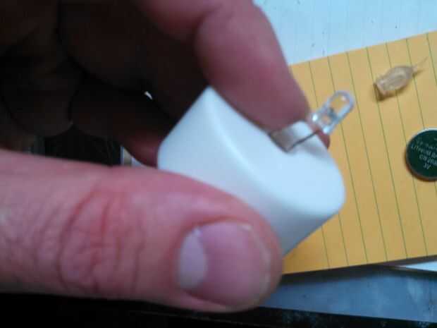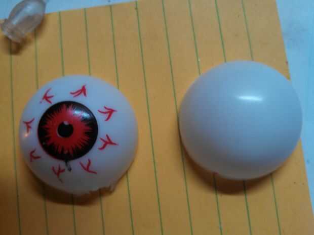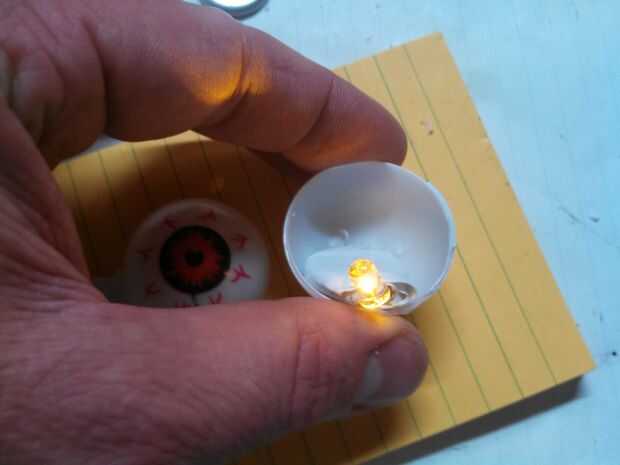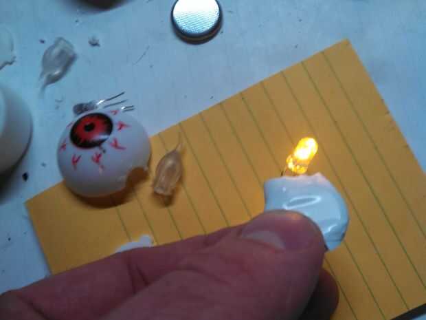 Todo lo que necesitas hacer es envolver los contactos LED alrededor de la batería con cinta aislante (blanco funciona mejor) y tiene una larga duración (120 horas) parpadeo LED que encaja perfectamente dentro de un globo ocular de zombie.