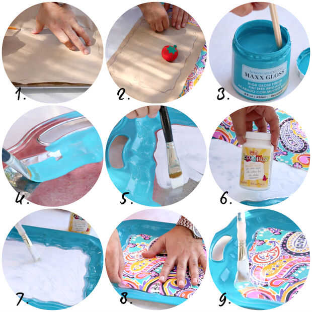 6. y 7. La base de la bandeja con Decoupage Americana del lustre de la capa