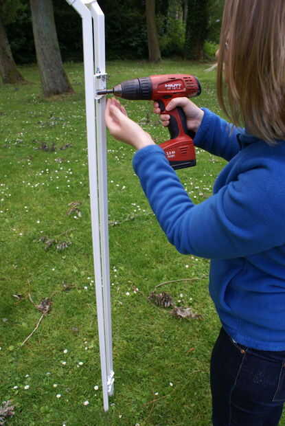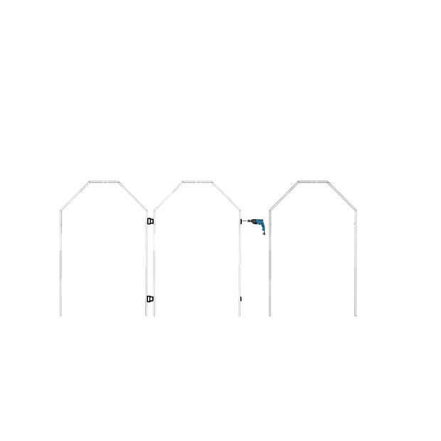 A continuación, tomar uno de los arcos. Coloque la bisagra en el lado del arco, en la pierna, 15 cm de la soldadura. Se taladra la primera bisagra al arco. Repetir este proceso para el otro lado del arco.