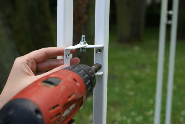 Después de instalar las 4 bisagras en el primer arco, tomar un segundo arco y coloque junto a la primera de ellas. Ahora puede perforar los agujeros para colocar las bisagras del primer arco en este arco, pero primero: Asegúrese de que la bisagra se coloca también a 15 cm de la soldadura superior!