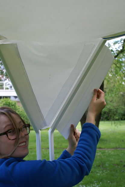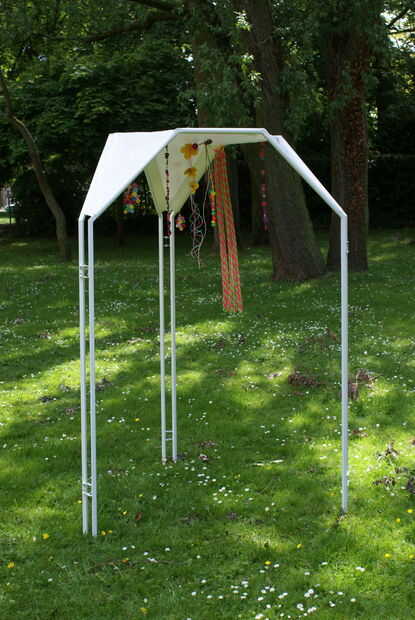 Ahora, el a los lados del techo con los lazos fijos (no los con velcro) y deslice los dos lados cuidadosamente sobre los arcos. Luego vuelva a colocar las bisagras. Ahora puede conectar los lazos restantes con el velcro sobre los tubos.
