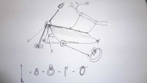 Necesita su bastón, cuerda, estacas, dos pinzas diferentes y lazos. Juntándolo Todo tiene una solución agradable y pequeña para dormir y un buen abrigo.