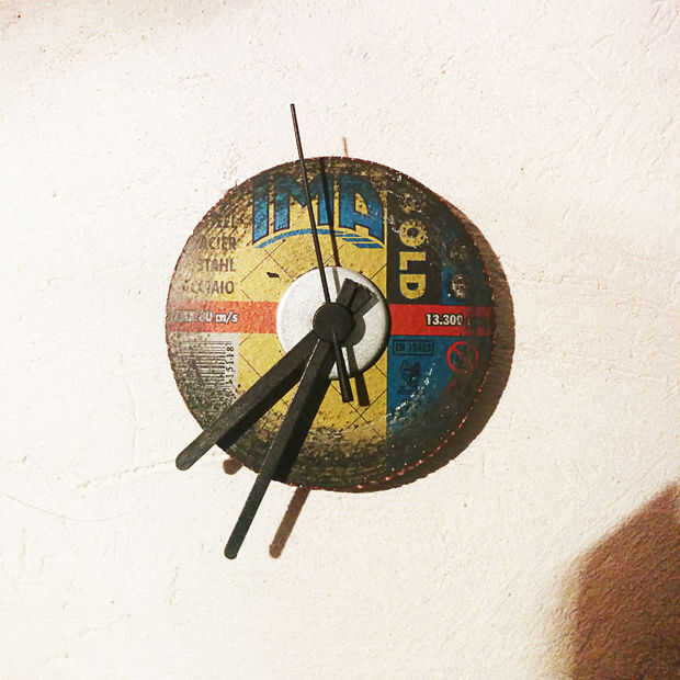 Anteriormente solía llevar mi reloj de pulsera conmigo cuando fui trabajando en mi tienda, seguimiento de tiempo. Pronto me di cuenta de que es casi imposible que se le mantenga todo cubierto de serrín. Además, tenía un motor de reloj antiguo que había sido tendido en el fondo de un cajón durante años, así que pensé que yo podría hacer buen uso de: cogí una batería y afortunadamente funcionó! Ahora el único problema era disponer de una cara bonita! Estaba seguro de algo se vienen a mi mente, y mirando en la tienda encontré un disco de amoladora de ángulo bastante usado. He añadido una arandela grande para mantener el disco centrado en el motor, rompió el reloj de mano y ahí la tienes: tu propia tienda-estilo reloj de pared!