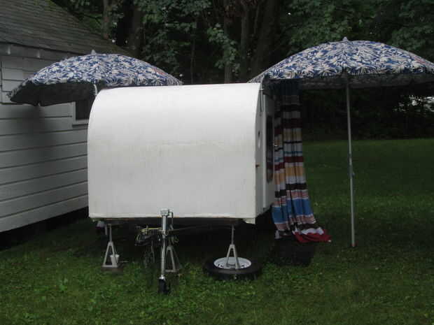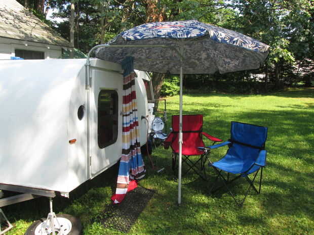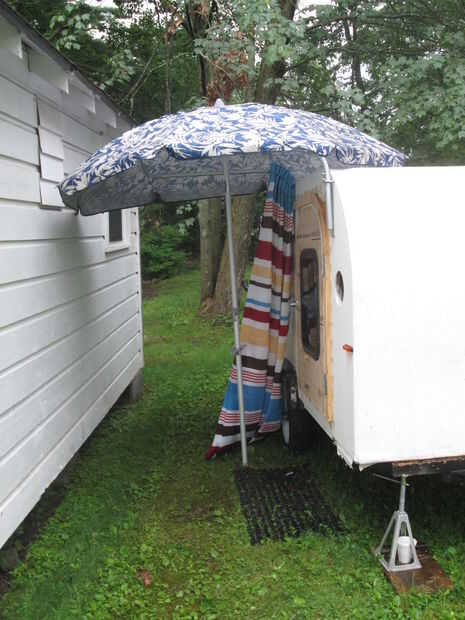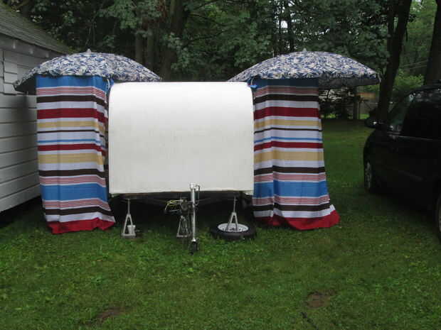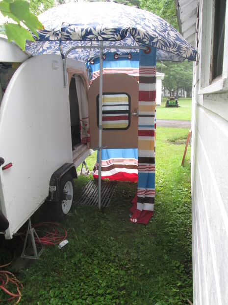 Cada vez campo llueve al menos una vez mientras estamos acampando, puse las sombrillas de playa y tenemos un área seca para salir en. Si era demasiado duro para conducir los tornillos de la arena en el suelo, coloco el polo de paraguas a través del doble lazo de la cortina de la ducha a mantener en su lugar el punto sobre el terreno, que funciona bien. Una mañana que también encontramos que las tiendas laterales eran perfectas para la observación de una familia de pavos salvajes rumbo a nuestro campamento sin encantamiento, siendo más alto pude sólo peek encima, mi esposa miraba entre las cortinas.
