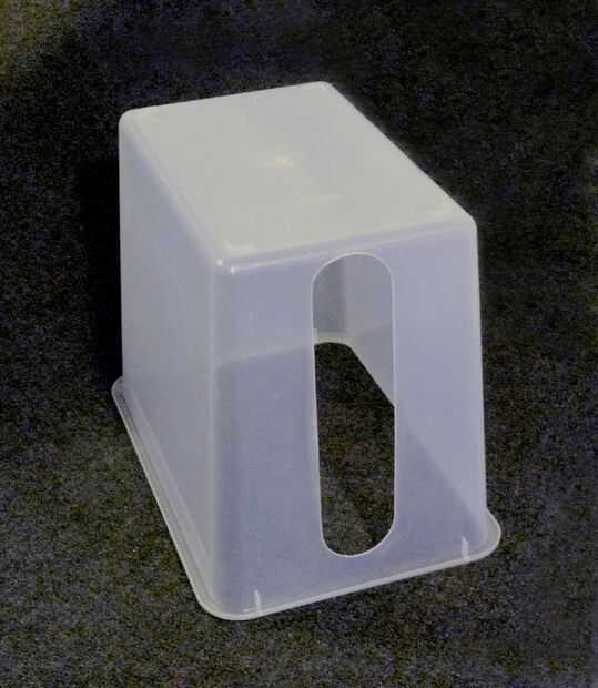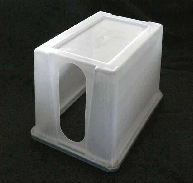 Me di cuenta que el plástico es una excelente solución a mi problema. Plástico conseguiría no efectuarse por la humedad y es fácil de limpiar; pero necesitaba algo más grande que un cubo. Decidí adaptar una caja de almacenaje plástica. Plástico ordinario carecía de la adecuada difusión así que modifiqué la translucidez con papel de lija.