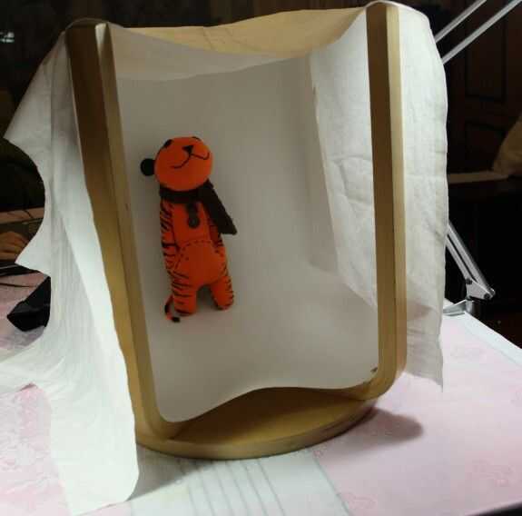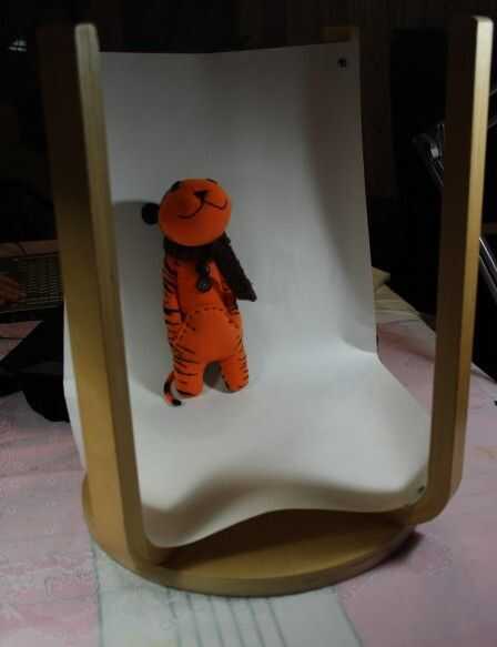 Poner heces sobre la mesa boca abajo. Fijar la hoja de papel con marcadores. Taburete de cubierta con tela blanca. Directas lámparas a los lados y parte superior del conjunto. Coloque su objeto. Disfrute :)