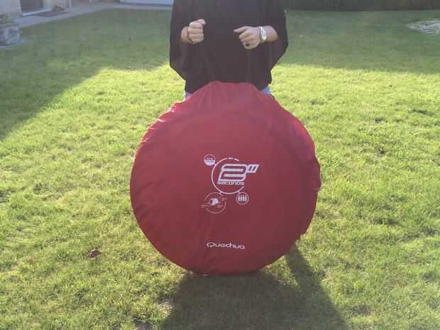 Trek tenslotte de opbergtas excedente de tienda heen en sluit de rits.