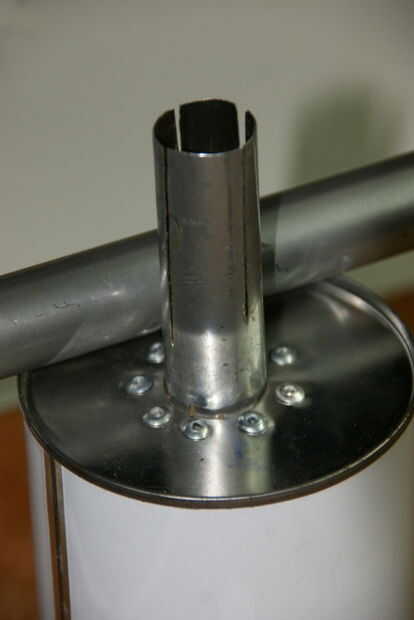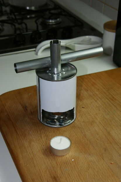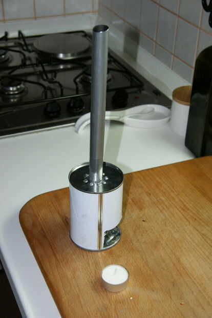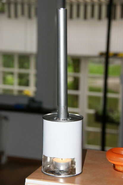 Primero, he probado un posible chimenea. Tiene que ser suficientemente frío en la parte superior para ir a través de un agujero en la tela de la carpa con una temperatura tan alta como 40-50 grados Celsius. Tomé una lata, cortar la puerta para la luz del té y había hecho una chimenea de 20 m m diámetro del mango de la escoba metal. Encienda una vela y mide a la temperatura en tubo de 120 cm por encima de la lata. El poder superior alcanzó una temperatura de 80 ° C y el tubo/chimenea de 120 cm tenía 40 C.