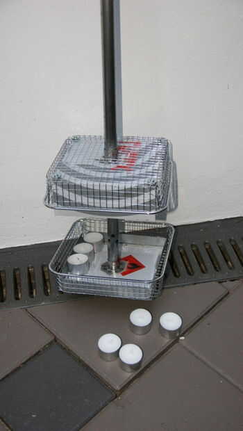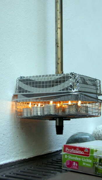 Trataba de fijar en el poste central. La caja inferior de la estufa es ocupada 8 cm por encima del piso y la caja superior se deslizan hacia arriba y hacia abajo para cargar las velas (o extinguir las llamas).