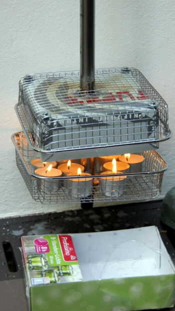 Llena de velas, les iluminado y visto. Todo era perfecto, el cuadro superior alcanzado a temps de la chimenea en 120cm y 240C mide 55 C. La temperatura exterior era 15C - sin viento. Tiempo de prueba era de 3.5 horas.