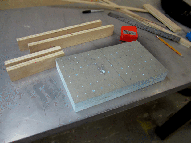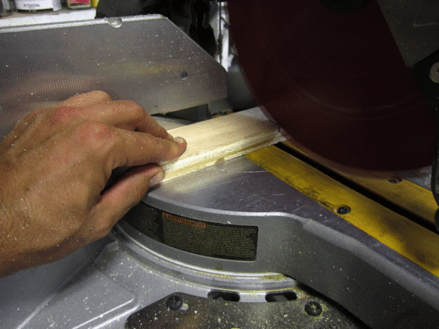 Medí el ancho del bloque de espuma (aproximadamente de 7" de ancho) y cortar dos de las tiras de madera contrachapada en el inglete compuesto vieron la misma longitud.